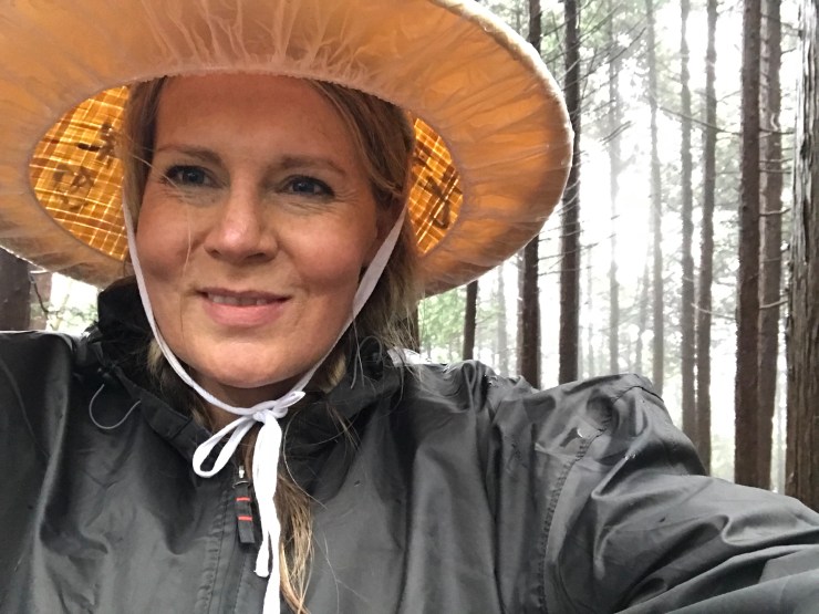 Slowly, slowly, gently planting the foot and straightening the knee, I try to keep to the sherpa technique I read of in Mindful Walking. Up and up and up, getting soaked to the skin. It is toasty warm though, under the poncho, under the rain jacket, and under the merino fleece, for wet or not, this is exertion like never before. As steep as it is, I am constantly surprised at how I manage it. I hear my breath, but I am not panting. With every breath I feel fitter. I do not know where this strength and desire to tackle this mountain are coming from, but I am enjoying it to the full. Beginner’s energy, I guess. There is something unusual in this vitality.