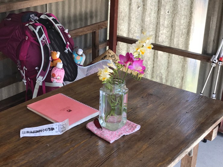 I told you about henro huts, the typically open wooden shelters where a pilgrim can rest. These huts seem to be placed at the most opportune times on the trail when the going is hard, or when you need to change in or out of rain gear, for example. They are well looked after, with a book for pilgrims to write a few words in on their journey. One hut I was in even had a fresh vase of freesias on the table.
