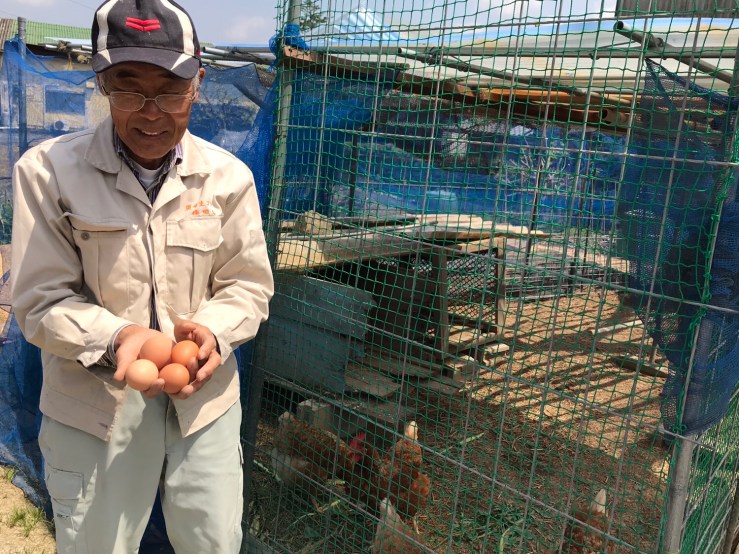 Another day, I pause in a chicken coop! A man on a country lane tells me „mo san kiro“ – another 3 km to the temple, and appears keen to show me his beautiful hens, clucking around their enclosure. Look, they‘ve laid eggs, he wants me to see. Go in! So I go in, rucksack and all, to admire the eggs. As I emerge and thank him, he tries to give me the eggs as an osettai. Thank you, but I cannot carry them in my rucksack. He tries so persistently to give me the eggs that I feel bad I can‘t take them. Ending our encounter with a photo, I bow and move on, in wonder at all my unusal experiences.