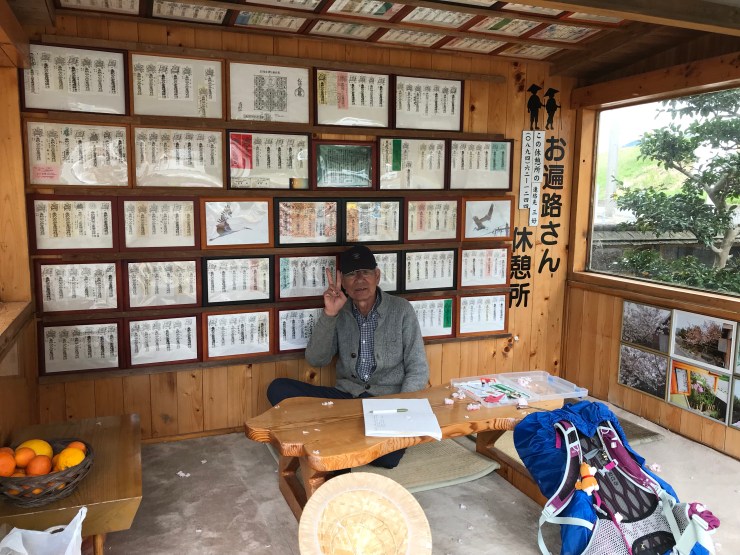 One particular hut is more of a trap, though. A man is sitting there on a cushion at the coffee table, waiting for passing henro. He beckons me in. Can you speak English is his bait. He‘s a local. He offers me an orange and tells me to sit. There is even a carpet in here, it‘s spotless, and there are photos of him with other pilgrims on the ceiling. I guess this hut is his property, and his man-cave. Wait a sec, he says, and comes back with his corgi dog and 2 cans of extra strong beer. It‘s mid-morning. What the heck, in for a penny, kanpai! He is glad for some company. He calls a local American friend of his up and puts me on the phone to him, trying to get me to attend a concert today. But I have to move on. The last attempt to keep me there drinking beer longer is a ceremonious one. He brings out a hand imprint, supposedly that of his Holiness Kobo Daishi, whose pilgrimage I am doing. Place your left hand on it. Say cheese. He snaps another photo for his hut. As a parting gift, he plucks some blossoms off the tree by the hut and showers me with them. Surreal.